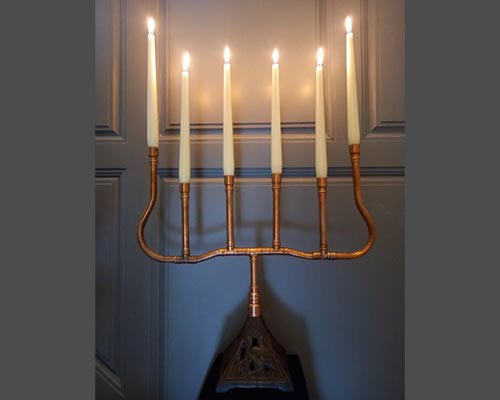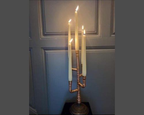 Copper steampunk candlelabra on oil lamp base